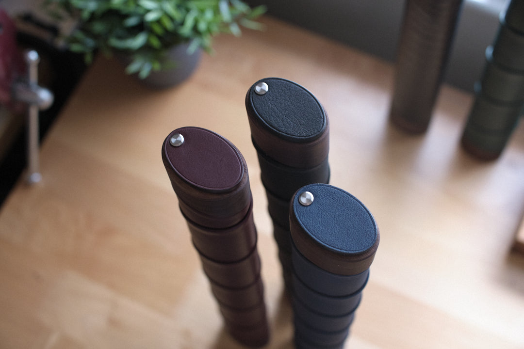 Cylinder-style case designed to safely carry batons up to 16 inches long and 1 inch in diameter. This case features solid walnut wood endcaps, stainless steel hardware, and is wrapped in beautiful full-grain leather from Rémy Carriat Tannery in France.